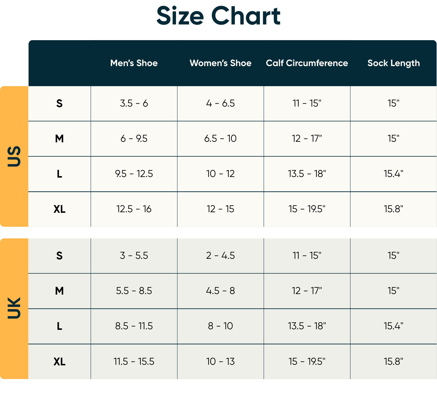 Not sure about your calf size? No worries, we offer a 100-day guarantee so you can try our socks at home and find the perfect size!